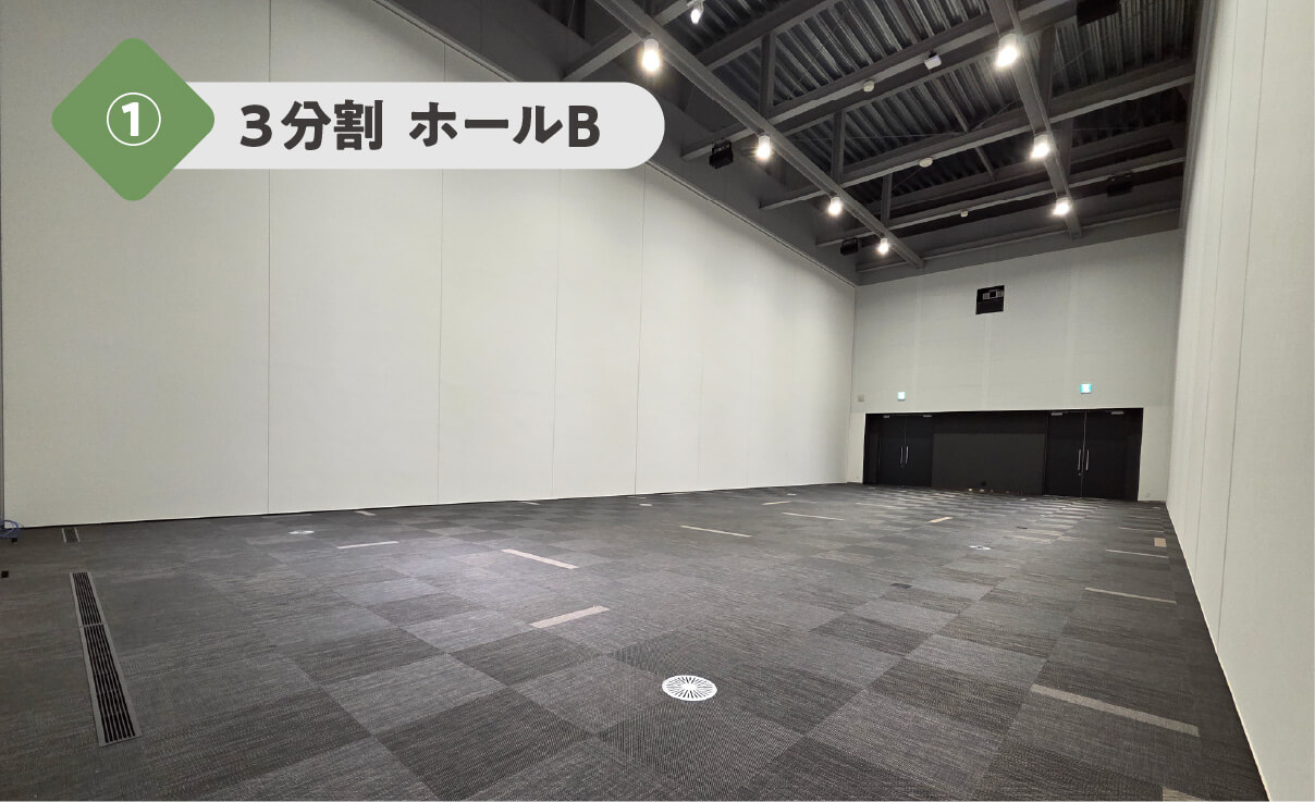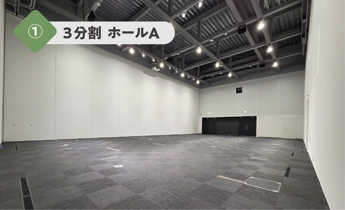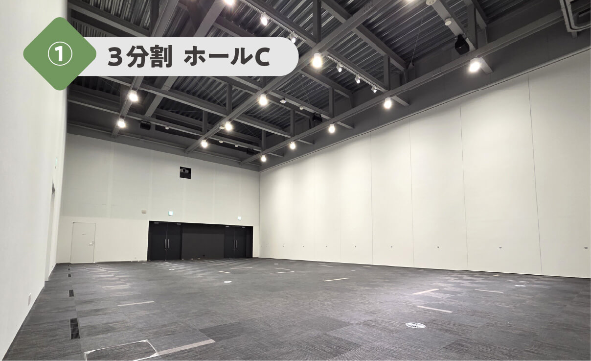ソシオスクエアの入口正面に位置するホールは、3つに分割できる柔軟な設計です。北側には常設のパントリーおよび搬入口を備え、式典から懇親会まで、さまざまなイベントを一つの場所でシームレスに開催できます。用途に応じた柔軟なレイアウト変更が可能です。