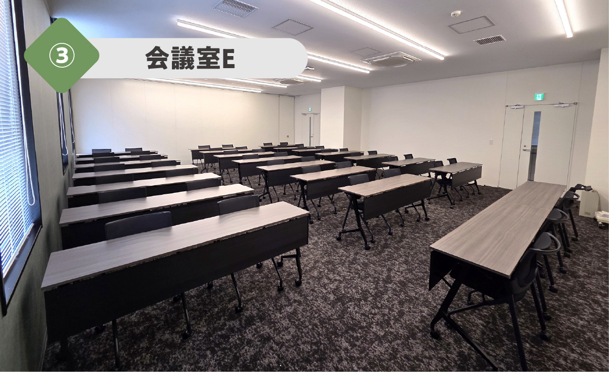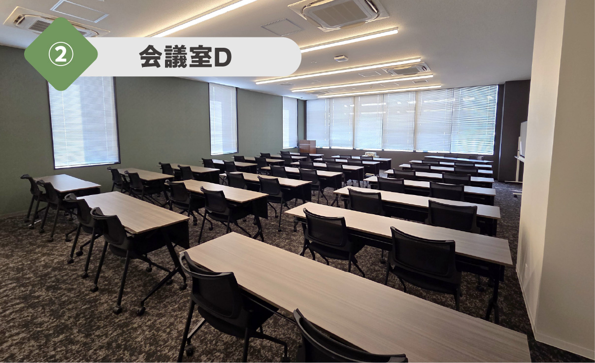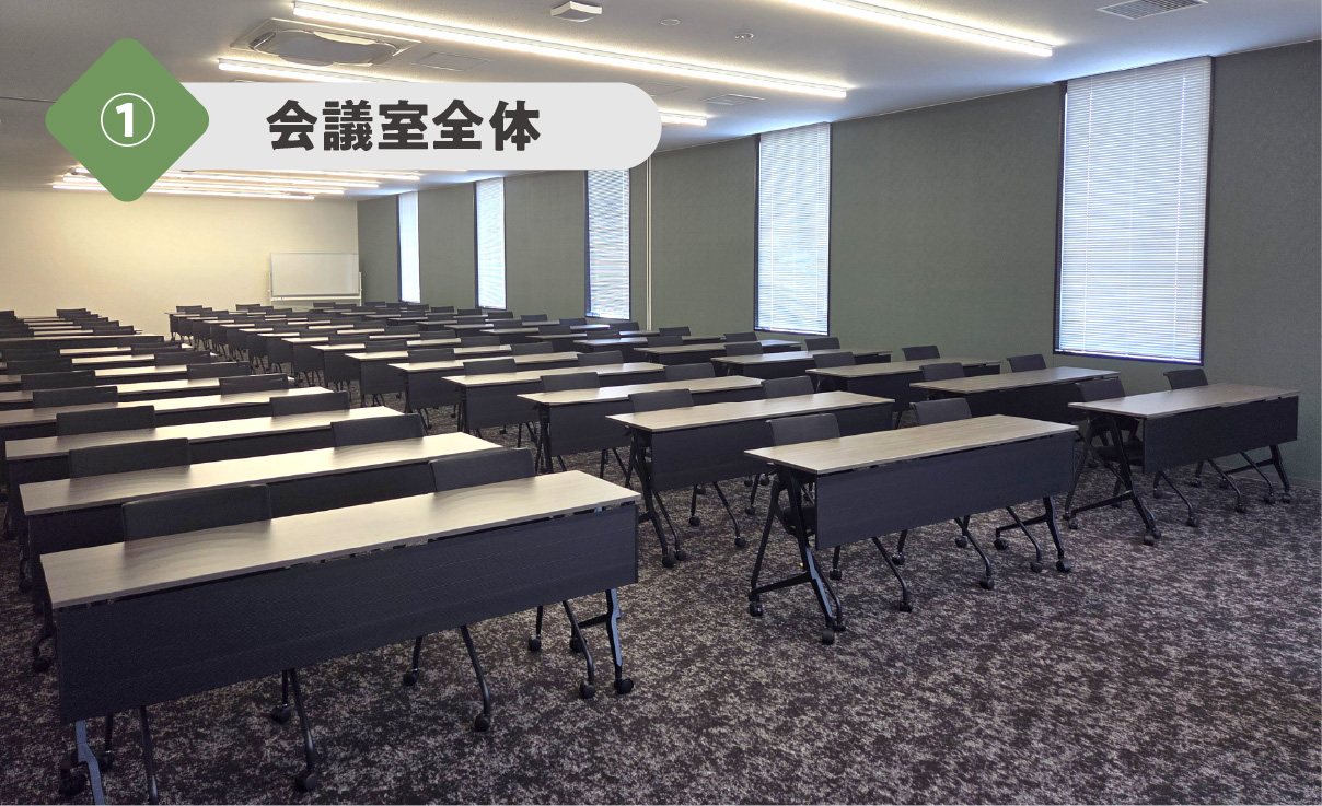 ソシオスクエア2Fに位置する会議室は、仕切りを使って2つの小会議室に分割でき、用途に応じた柔軟な利用が可能です。長机は二人掛けとして配置することで、ゆったりとしたスペースを確保し、快適な会議環境を提供します。